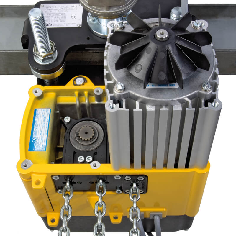 Serienmäßig sind Betriebsendschalter für die höchste und tiefste Hakenstellung integriert. Zudem überwacht eine Rutschkupplung den Kraftfluss und schreitet beim Überfahren des Betriebsendschalters oder einem versehentliche Überlasten ein. Diese Sicherheitseinrichtungen schützen das Gerät und verlängern die Lebensdauer von Motor und Getriebe.