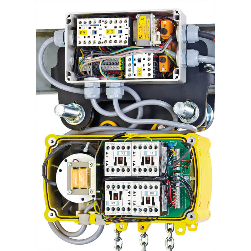 Wahlweise sind die Elektrokettenzüge von Yale mit oder ohne Schützensteuerung erhältlich. Die Schützensteuerung arbeitet mit einer Steuerspannung von 42 V. Diese Kleinspannung ist ungefährlich und erhöht die Sicherheit für den Bediener, der über die Steuerflasche die elektrischen Befehle an den Kran von Hand weiter gibt. Zudem ist der Steuerschalter nach der Schutzklasse IP65 staubdicht und geschützt gegen Strahlwasser aus einem beliebigen Winkel. Mit dieser Kapselung ist ein Eindringen von Wasser nahezu ausgeschlossen.