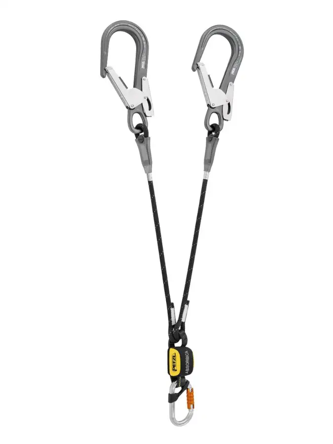 Geliefert mit zwei MGO-Verbindungselementen mit großer Schnapperöffnung am Ende des Verbindungsmittels für die Befestigung an der Metallstruktur und einem OK TRIACT-LOCK-Verbindungselement für die Befestigung am Gurt.