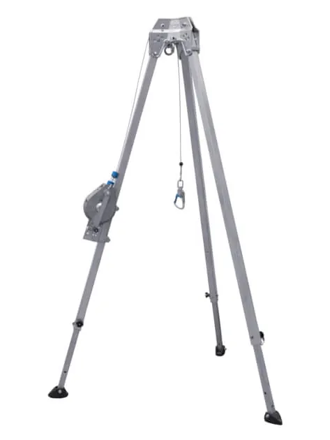 Der Dreibaum bietet schon in der Grundausstattung teleskopierbare Beine, die durch Steckbolzen in jeweils 8 Positionen fixiert werden können, 3 Aufhängeösen im Kopf, an denen beispielsweise Flaschenzüge, Höhensicherungsgeräte oder Abseiler mittels Schlinge oder Schäkel befestigt werden können. Zudem dienen die Anschlagösen nach EN 795 Typ B als Anschlagpunkte, an denen sich der Sicherungsposten sichern kann. Die Füße des Dreibaums sind mit einer beweglichen Gummisohle versehen und sorgen für einen festen Stand.