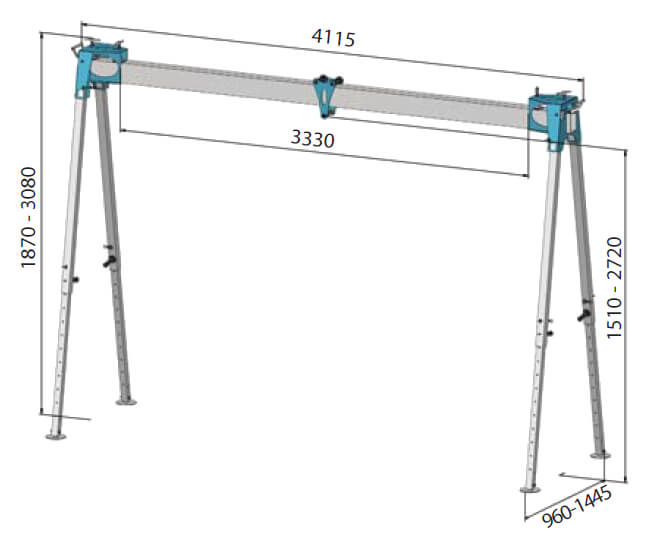Die Gelenkverbindungen zwischen den Trägern und Stützen ermöglichen das mühelose Aufstellen des Kranes von einer Person: die vier Stützen werden ausgeklappt, mit Steckbolzen gesichert und in der gewünschten Höhe eigestellt. Hierbei ist besonders die als Zubehör erhältliche Aufstellhilfe von Nutzen.