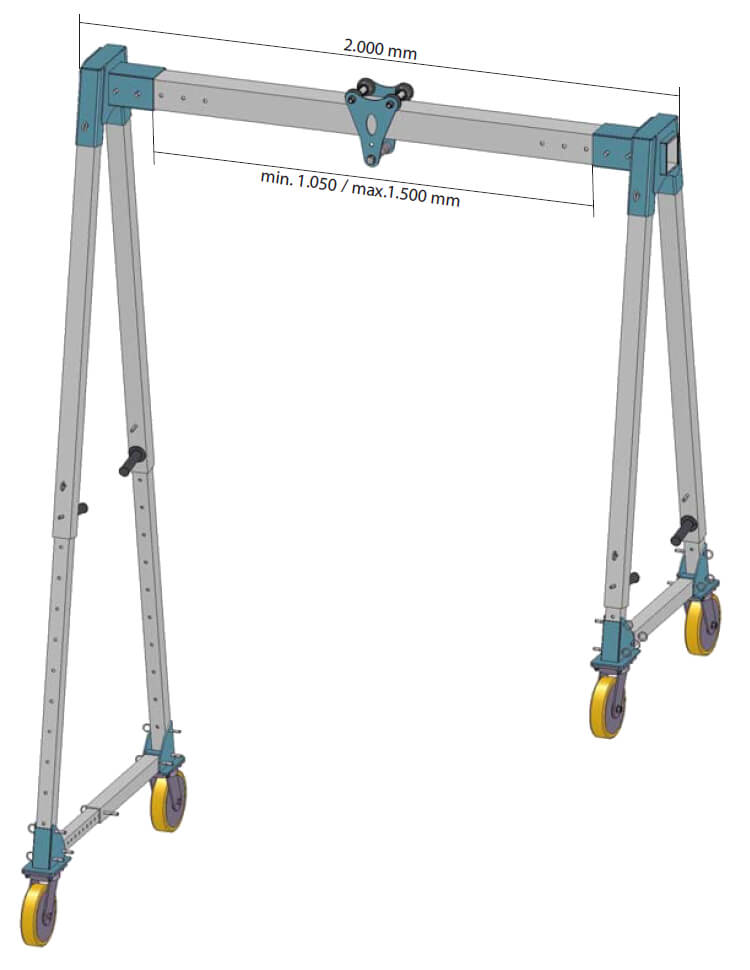 Der Kran ist durch einfache Steckbolzenverbindungen in der Breite und Höhe verstellbar. Die großen Vulkollan-Räder haben einen Durchmesser von 200 mm und sind mit Lenk- und Radstopp ausgestattet.