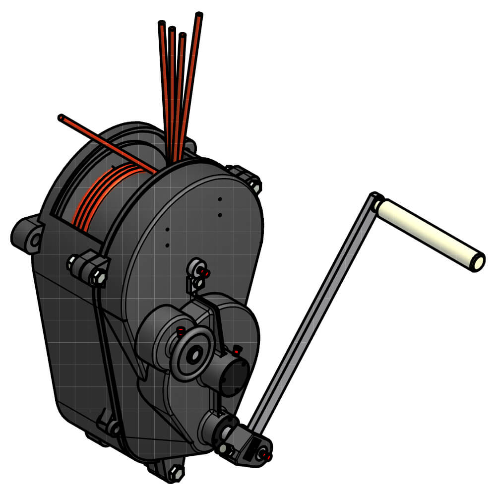 Der Seilabgang ist normalerweise senkrecht nach oben. Es ist aber auch eine Überkopfmontage und der Seilabgang nach unten möglich, sowie in jede andere Richtung auch.