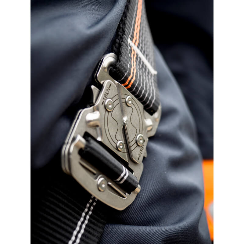 Die Fidlock-Schnallen an den Beinschlaufen schnappen magnetisch ein und schließen fast automatisch. Schon beim Annähern der Schnallen schlüpfen die Hälften selbsttätig, wie von Geisterhand geführt ineinander. Ein weiterer Sicherheitsaspekt ist die schmale Form der Schnallen. Sie stehen seitlich nicht hervor und stören selbst dann nicht, wenn es mal eng wird, beispielsweise beim Einstieg in Silos.
