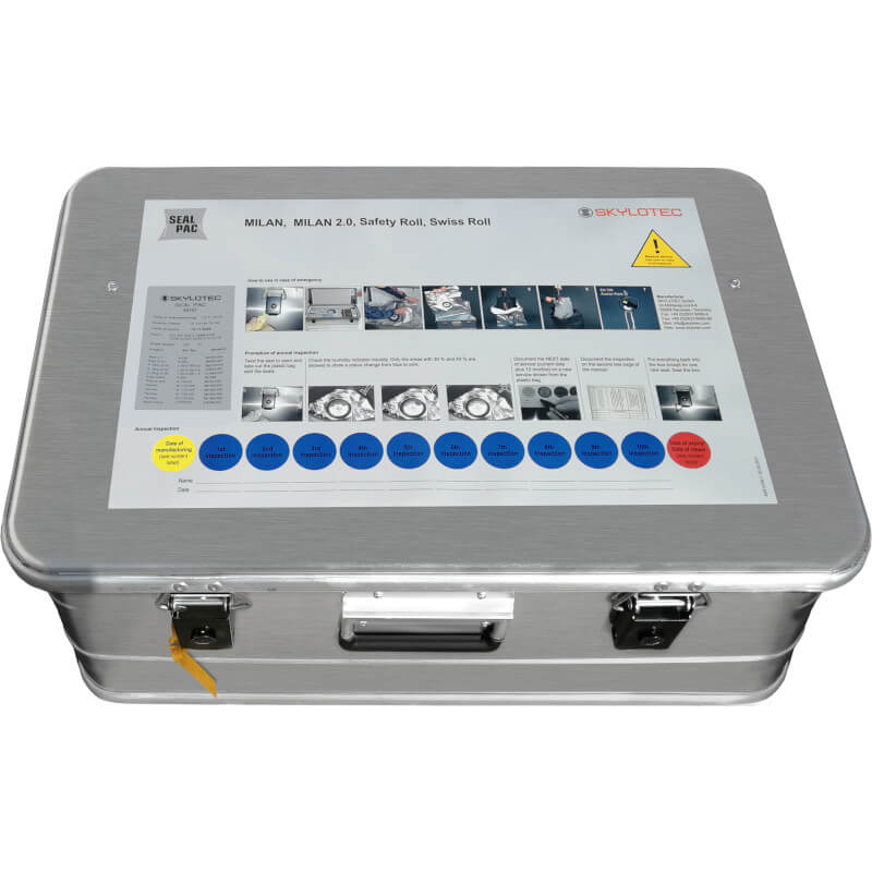 Alle Rettungsgeräte, auch ungenutzte, die für Notfälle vorgehalten werden, müssen einmal jährlich geprüft werden. Mit dem SEAL PAC wird diese regelmäßige Kontrolle vereinfacht. Das MILAN-Gerät liegt dazu in einer speziell versiegelten Aluminiumbox. Ein autorisierter Prüfer öffnet einmal im Jahr die Box und überprüft den Feuchtigkeitsindikator an der MILAN-Verpackung auf einwandfreien Soll-Zustand. Ist der Zustand in Ordnung, markiert der Prüfer Monat und Jahr der nächsten Inspektion, unterschreibt und versiegelt die Metallbox erneut mit einem SEAL PAC-Siegel. Dieses vereinfachte Revisionsverfahren spart Zeit und Kosten und es fallen keine aufwändigen Transportwege an. Die Einsatzzeit eines SEAL PACs beträgt 10 Jahre. Die Möglichkeit zum einmaligen Re-Sealing besteht nach 10 Jahren bis zu einer Gesamtlebensdauer von maximal 20 Jahren. ABMESSUNG SET 80m: 550x350x245mm