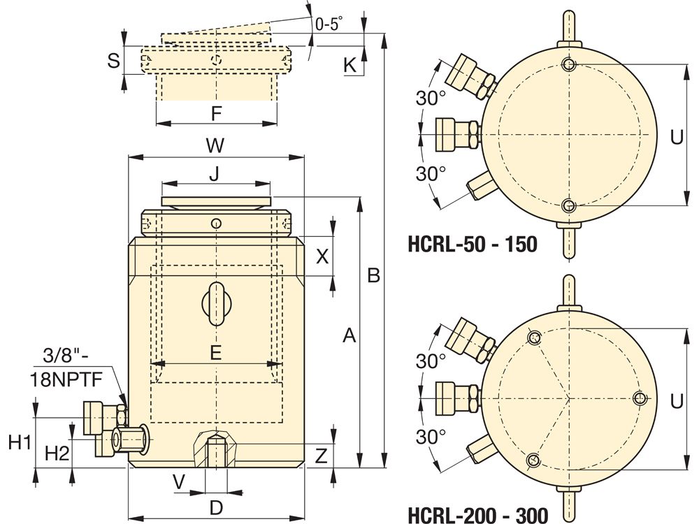 | Doppeltw. mit Mutter HCRL | Druckkraft (t) | Bauhöhe eingefahren A (mm) | Bauhöhe ausgefahren B (mm) | Außendurchmesser D (mm) | Innendurchmesser E (mm) | Kolbenstangen durchmesser F (mm) | Basis bis Ausfahr-Anschluss H1 (mm) | Basis bis Einfahr-Anschluss H2 (mm) | Druckstückdurchmesser J (mm) | Druckstücküberstand K (mm) | Höhe Sicherungsmutter S (mm) | Bodenbefestigungsbohrungen LochkreisØ U (mm) | Bodenbefestigungsbohrungen Gewinde V (mm) | Außengewinde W (mm) | Befestigungsgewindelänge X (mm) | Bodenbefestigungsbohrungen Gewindetiefe Z (mm) |