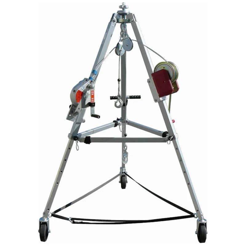 Der Dreibaum auf Rädern ist ein unglaublich praktisches Gerät für Arbeitsstätten, die nahe bei einander sind. So kann er beispielsweise von einem Schacht zum anderen verfahren werden, ohne ihn für den Transport zerlegen zu müssen. Auch ist das Bergen von Gegenständen aus den Schächten, beispielsweise von Kanalabdeckungen oder geretteten Personen ein leichtes, da diese relativ einfach aus der Gefahrenzone entfernt werden können. Der Dreibaum ist zur Einstiegssicherung von Kanälen und Schächten einschließlich Höhensicherungsgerät mit Rettungsfunktion und Lastwinde (bis max. 300 kg), komplett mit Halterungen und Umlenkrollen ausgestattet. Die Lastwinde darf nur zum Ablassen und Anheben von Materialien eingesetzt werden. Die Standbeine sind teleskopierbar um den Dreibaum bei Bedarf zerlegen zu können oder um ihn in der Höhe justieren zu können. Maximal zwei Personen können sich gleichzeitig am Dreibaum sichern. Seine Transportlänge ist gerade mal 1,38 m groß, so daß er im zerlegten Zustand platzsparend verstaut werden kann. Neben den drei Vollgummirädern gehört zur umfangreichen Ausstattung eine Handdeichsel zum leichteren Manövrieren. Diese dient gleichzeitig als Feststellbremse, solange der Dreibaum im Einsatz ist.