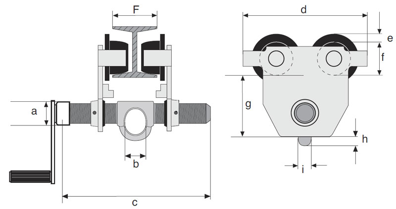 Ein Gewindelastbolzen mit Handgriff bzw. Kurbel ermöglicht die feine Anpassung an die Trägerbreite, während Stahlräder mit Kugellagern für ruhige Laufeigenschaften und geringen Schiebeaufwand sorgen.