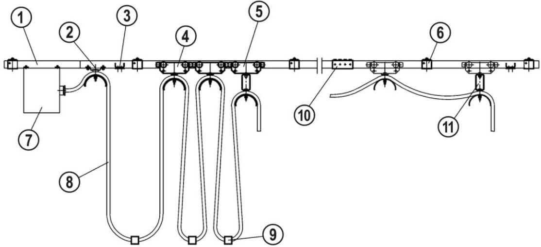 Das Leitungswagensystem von TOMANRO besteht aus C-Schienen, Schienenbefestigungsmaterial, Endklemme, Leitungs- und Mitnehmerwagen und dem Kabel. Ein Mitnehmerarm liegt dem Sortiment bei, der am ortsveränderlichen Verbraucher befestigt wird und den Mitnehmerwagen mitführt. Je nach Fahrtrichtung des Verbrauchers, zieht der Mitnehmerwagen die nachfolgenden Leitungswagen hinter sich her oder schiebt sie in den Bahnhof zurück.