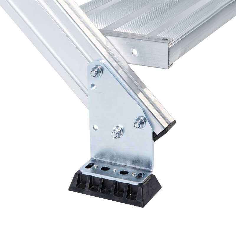 • Stufen- und Plattformbelag serienmäßig aus Aluminium gerieft (R10). Wahlweise auch als Stahl-Gitterrost (R12) und Stahl-Lochblech (R13) für bessere Rutschfestigkeit erhältlich.