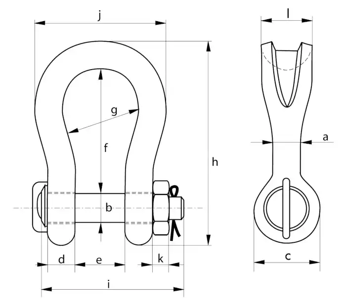 Bügel und Bolzen bestehen aus legiertem Stahl, Güteklasse 8, sind vergütet (quenched & tempered), besitzen einen Sicherheitsfaktor von MBL = 5 × WLL und sind für einen Temperaturbereich von typ. -20 °C bis +200 °C freigegeben.