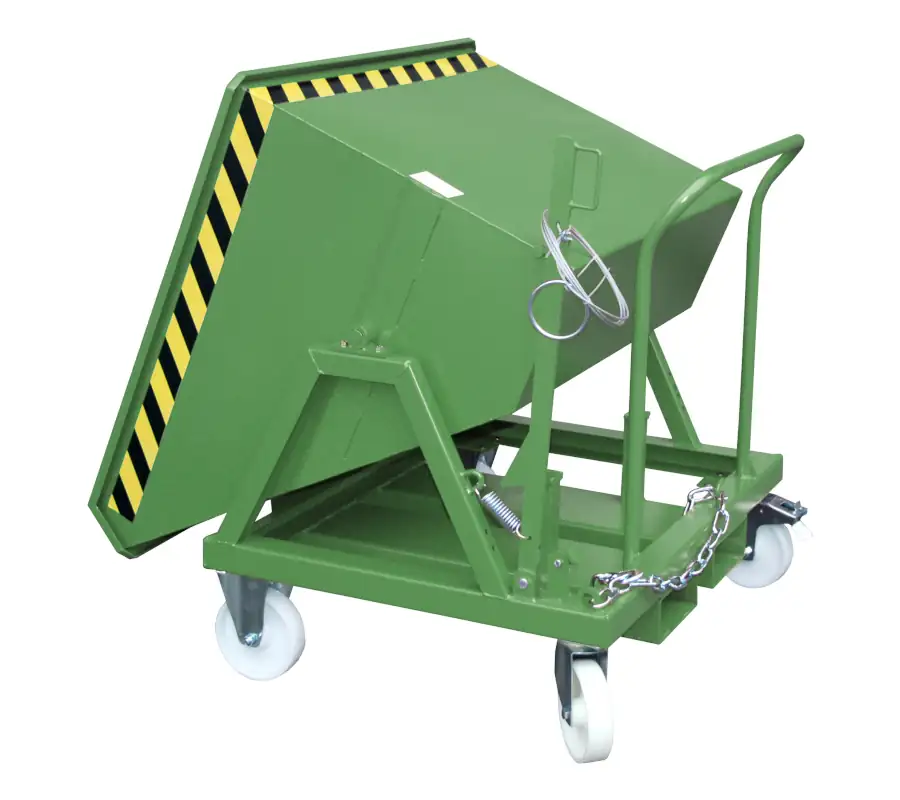 Die Späne-Kippmulde Typ KS lässt sich sowohl ebenerdig von Hand als auch mittels Gabelstapler über Großcontainer entleeren. Im Transport und der Art der Entleerung bietet diese Kippmulde eine hohe Flexibilität. Durchgehend geschlossene Einfahrlaschen sorgen für eine einfache Aufnahme mit einem Gabelstapler. Während des Transports, sichert eine Kette den Behälter auf den Gabelzinken und verhindert ein unbeabsichtigtes Abrutschen.