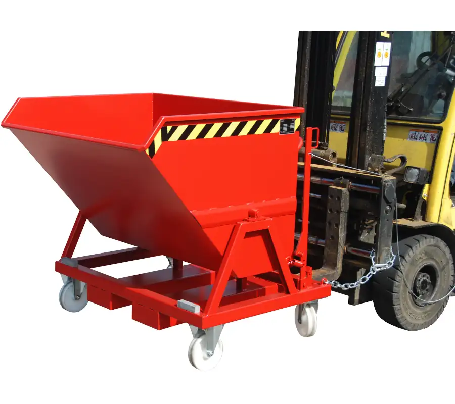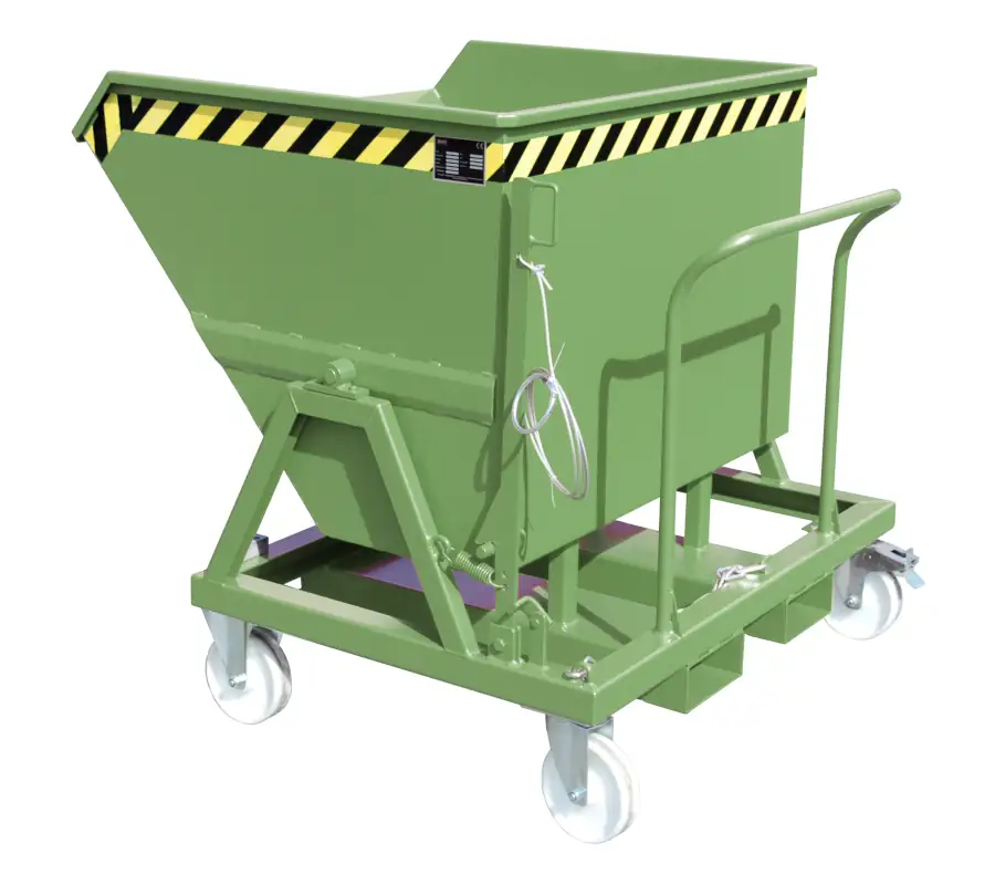 Die Späne-Kippmulde Typ KS lässt sich sowohl ebenerdig von Hand als auch mittels Gabelstapler über Großcontainer entleeren. Im Transport und der Art der Entleerung bietet diese Kippmulde eine hohe Flexibilität. Durchgehend geschlossene Einfahrlaschen sorgen für eine einfache Aufnahme mit einem Gabelstapler. Während des Transports, sichert eine Kette den Behälter auf den Gabelzinken und verhindert ein unbeabsichtigtes Abrutschen.