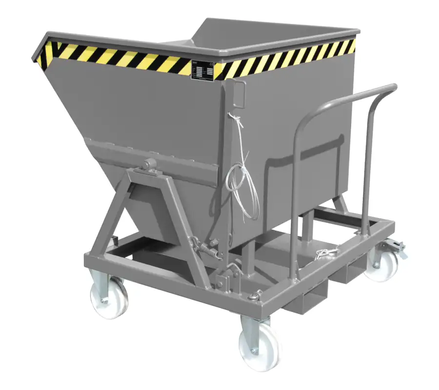 Die Späne-Kippmulde Typ KS lässt sich sowohl ebenerdig von Hand als auch mittels Gabelstapler über Großcontainer entleeren. Im Transport und der Art der Entleerung bietet diese Kippmulde eine hohe Flexibilität. Durchgehend geschlossene Einfahrlaschen sorgen für eine einfache Aufnahme mit einem Gabelstapler. Während des Transports, sichert eine Kette den Behälter auf den Gabelzinken und verhindert ein unbeabsichtigtes Abrutschen.