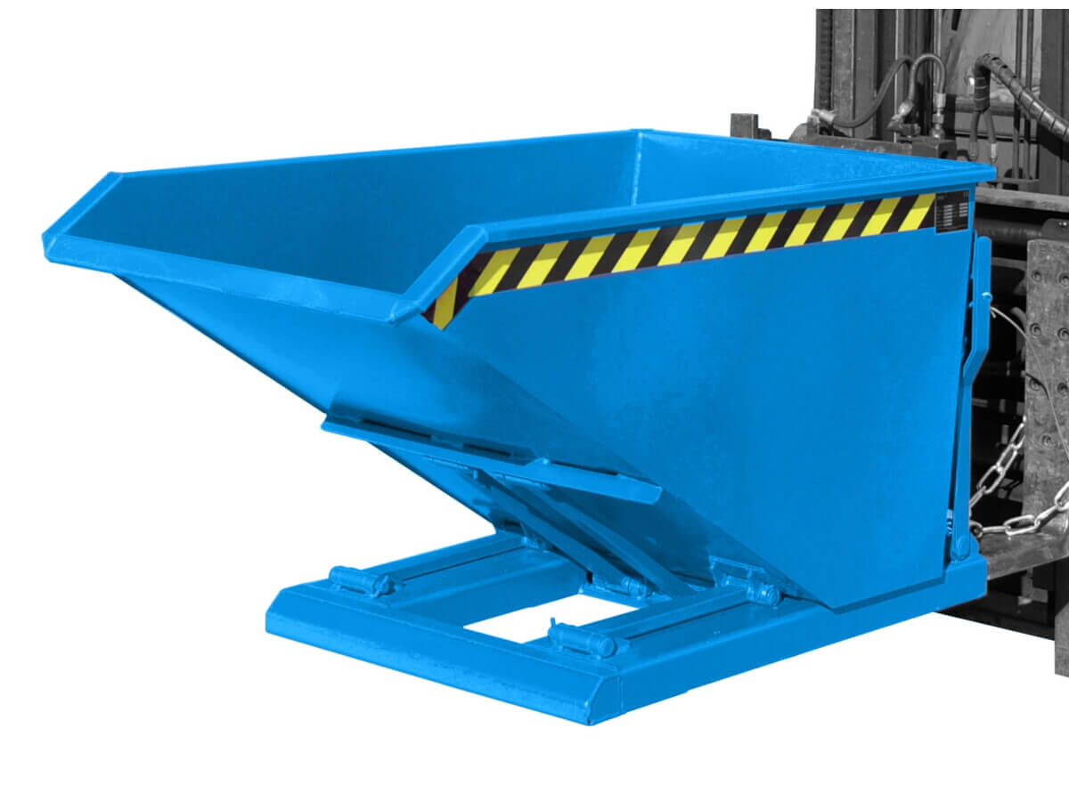 Der Kippbehälter Typ NK ist mit einem Scheren-Kipp-Mechanismus ausgestattet, der ein Entleeren weit in den Container hinein ermöglicht. Durch ein raffiniertes Scherengestänge kippt die Mulde über die äußerste Kante des stabilen Grundrahmens. Über einen Seilzug wird das Auskippen vom Fahrersitz aus initiiert. Der optimierte Lastschwerpunkt begünstigt ein vollständiges Entleeren und ein schonendes wieder Einfahren des Kippbehälters. Das Wannenblech wird von einem umlaufenden Randprofil gerahmt. Im Grundrahmen befinden sich die durchgehend geschlossenen Einfahrtaschen, die die Aufnahme mit einem Gabelstapler erleichtern. Während des Transports mit einem Gabelstapler wird der Kippbehälter NK mit einer Kette gegen unbeabsichtigtes abrutschen von den Gabelzinken gesichert.