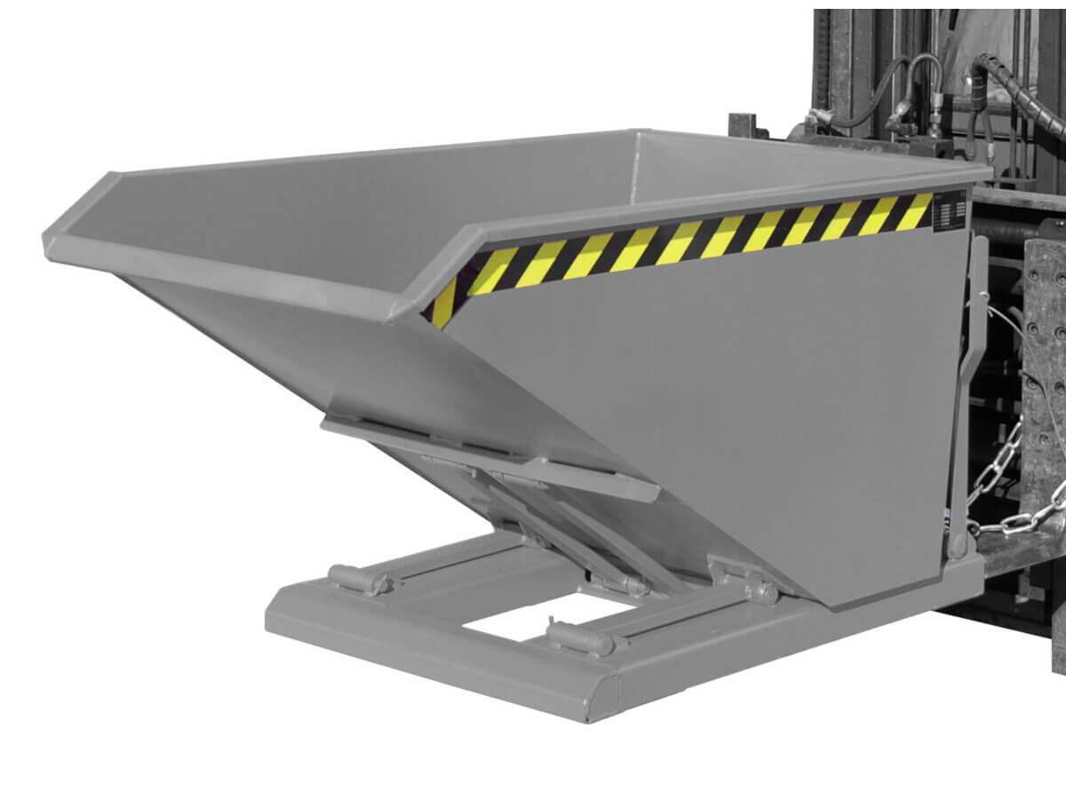 Der Kippbehälter Typ NK ist mit einem Scheren-Kipp-Mechanismus ausgestattet, der ein Entleeren weit in den Container hinein ermöglicht. Durch ein raffiniertes Scherengestänge kippt die Mulde über die äußerste Kante des stabilen Grundrahmens. Über einen Seilzug wird das Auskippen vom Fahrersitz aus initiiert. Der optimierte Lastschwerpunkt begünstigt ein vollständiges Entleeren und ein schonendes wieder Einfahren des Kippbehälters. Das Wannenblech wird von einem umlaufenden Randprofil gerahmt. Im Grundrahmen befinden sich die durchgehend geschlossenen Einfahrtaschen, die die Aufnahme mit einem Gabelstapler erleichtern. Während des Transports mit einem Gabelstapler wird der Kippbehälter NK mit einer Kette gegen unbeabsichtigtes abrutschen von den Gabelzinken gesichert.