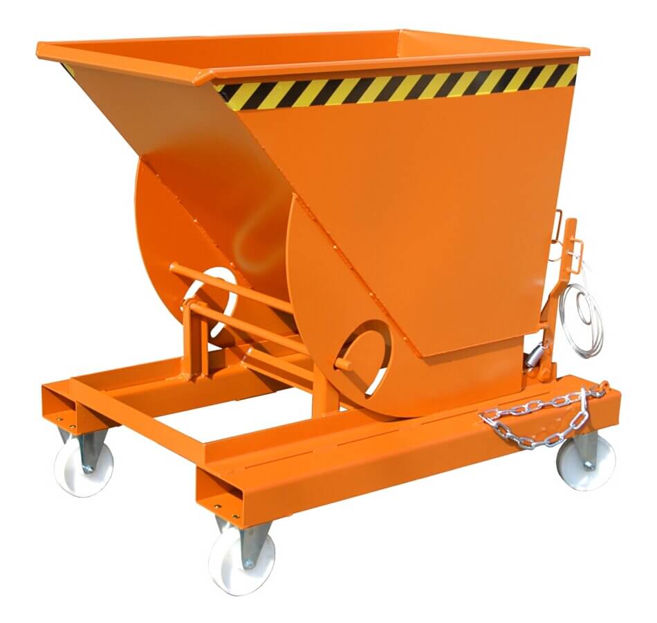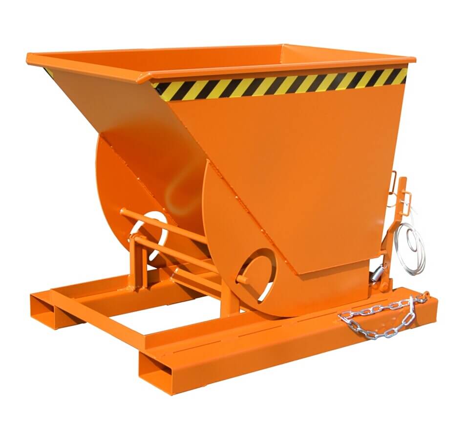 Der Kippbehälter Typ AK ist ein universeller Sammelcontainer für Stückgüter oder Produktionsabfälle. Sein Abrollsystem in Kombination mit einem günstigen Lastschwerpunkt gewährleistet beim Abkippen eine vollständige Entleerung. Das Kippen ist in jeder Höhe bequem per Seilzug vom Fahrersitz aus möglich. Durchgehend geschlossene Einfahrtaschen im Grundrahmen sorgen für eine einfache Aufnahme mit einem Gabelstapler. Das Wannenblech ist durch ein umlaufendes Randprofil ausgesteift und rollt auf einer Verzahnung ab. Eine Sicherungskette sorgt für guten Halt beim Transport mit einem Gabelstapler und verhindert ein ungewolltes Abrutschen von den Zinken. Praktisch ist, dass der Kippbehälter AK auch mittels Gabelhubwagen aufgenommen werden kann und somit innerbetrieblich leicht zubewegen ist.