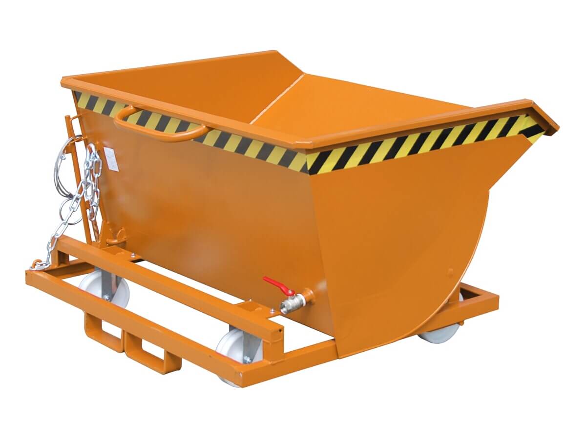 Der Spänebehälter SKM von Bauer Südlohn wird häufig zerspanenden Automaten beigestellt. Er sammelt, trennt und vereinfacht das Entsorgen. Mittels Siebblech wird die Bohrmilch oder das Kühlmittel vom Feststoff getrennt. Über den integrierten Kugelhahn kann die Flüssigkeiten abgelassen werden. Die Mulde, aus dickem Wannenblech und umlaufendem Randprofil, ist öl- und wasserdicht verschweißt. Zum Abkippen rollt die Wanne auf den Schienen des stabilen Grundrahmens ab. Durch den günstigen Lastschwerpunkt wird ein gabelstaplerschonendes Entleeren sichergestellt. Einfahrtaschen für Gabelzinken gewährleisten die sichere Aufnahme durch ein Flurförderzeug. Der Fahrer kann den Kippvorgang einfach per Seilzug von seinem Staplersitz aus entriegeln. Während des Transports sichert eine fest installierte Kette den Kippbehälter vor dem Abrutschen. Um ein Optimum an Mobilität zu gewährleisten verfügt der Spänebehälter über ein leichtgängiges Fahrwerk, bestehend aus Bock- und Lenkrollen. Ein Schiebegriff vereinfacht das Manövrieren.