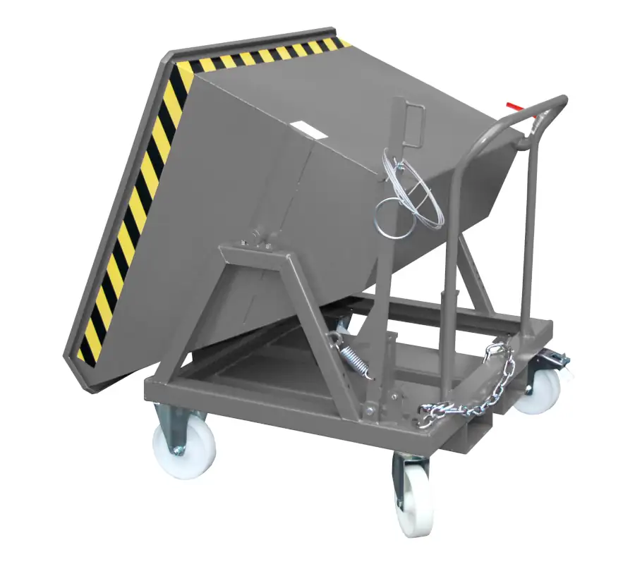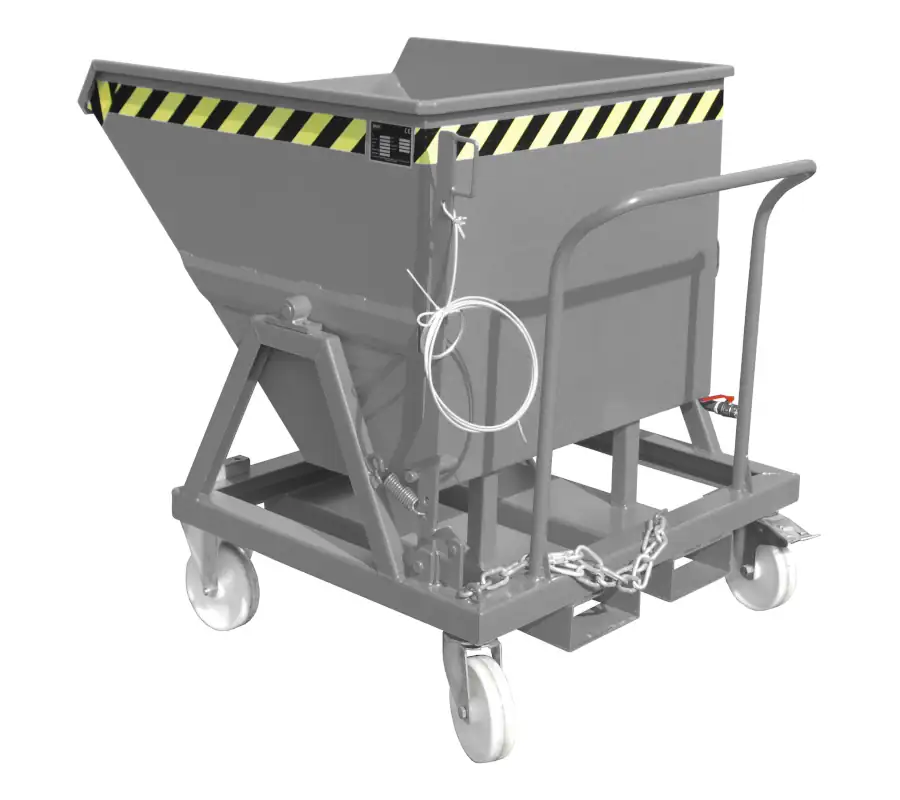 Die Späne-Kippmulde Typ SKS lässt sich sowohl ebenerdig von Hand als auch mittels Gabelstapler über Großcontainer entleeren. Bei der Art der Entleerung bietet diese Kippmulde eine hohe Flexibilität. Durchgehend geschlossene Einfahrlaschen sorgen für eine einfache Aufnahme mit einem Gabelstapler. Während des Transports, sichert eine Kette den Behälter auf den Gabelzinken und verhindert ein unbeabsichtigtes Abrutschen. Bequem wird das Abkippen mit einem Zugseil vom Fahrersitz aus eingeleitet. Die Späne-Kippmulde SKS lässt sich aber auch manuell entleeren. Das Kippmoment liegt bei diesem Behälter weit vorne, sodass das Kippen der Mulde auch von Hand erfolgen kann. Zum Entleeren ist die Mulde hierfür mit einem Handgriff ausgestattet. Der kleine Container ist auf Rollen leicht verfahrbar. Ein Schiebegriff erleichtert das Manövrieren. Die Bock- und Lenkrollen sorgen für gute Fahreigenschaften.