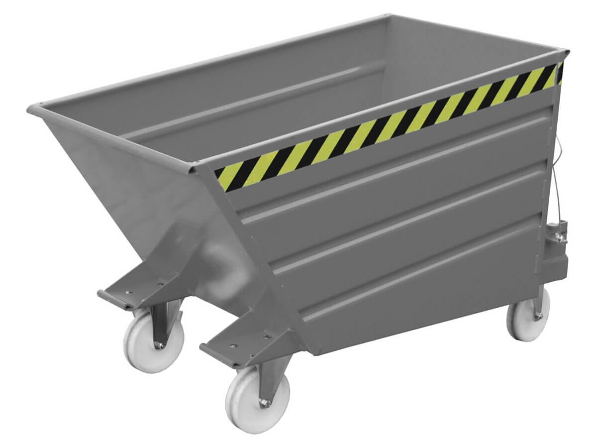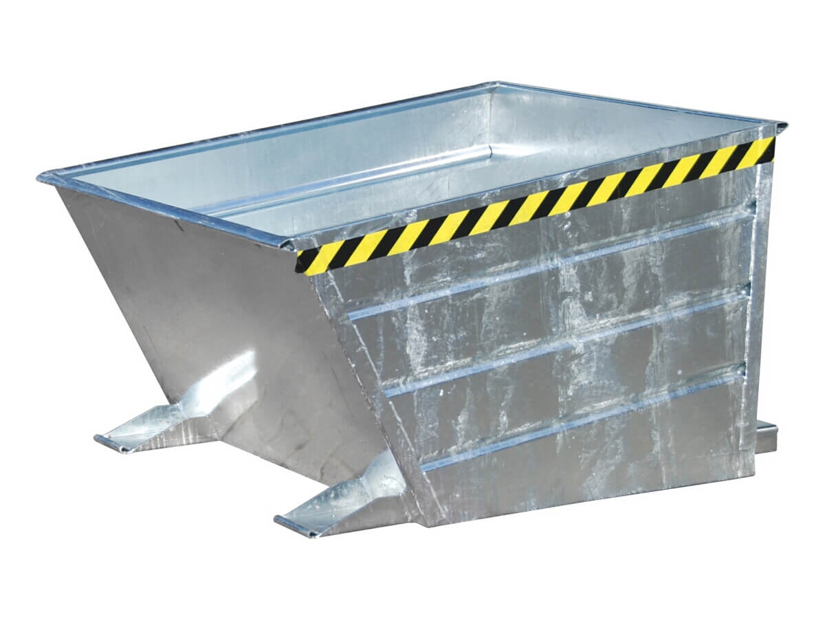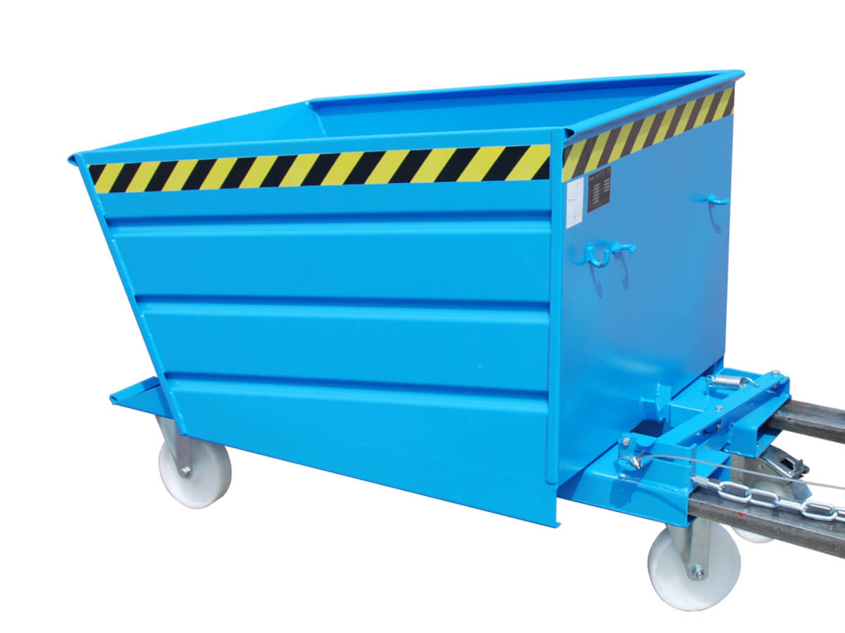 Die Behälter verfügen über einen innovativen Hebelverschluss, der es dem Staplerfahrer erlaubt, das Kippen des Behälters per Seilzug vom Fahrersitz aus einzuleiten. Über die Fernauslösung ist das Kippen aus jeder Höhe möglich. Durchgehend geschlossen Staplereinfahrtaschen erleichtern die Aufnahme mit einem Gabelstapler. Optional stehen Rollen zur Verfügung, mit denen er im innerbetrieblichen Einsatz leicht von Hand verfahren werden kann. Außerdem ist ein verzinkter Deckel, eine öl- und wasserdichte Verschweißung und eine einstellbare Kippbremse auf Wunsch erhältlich.