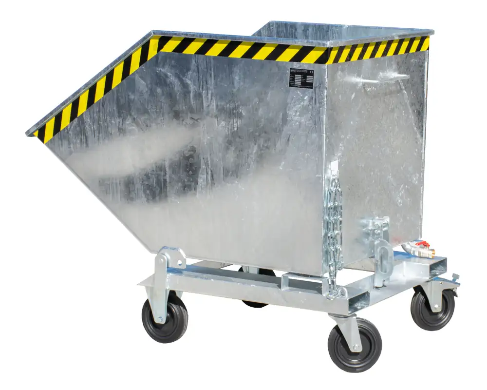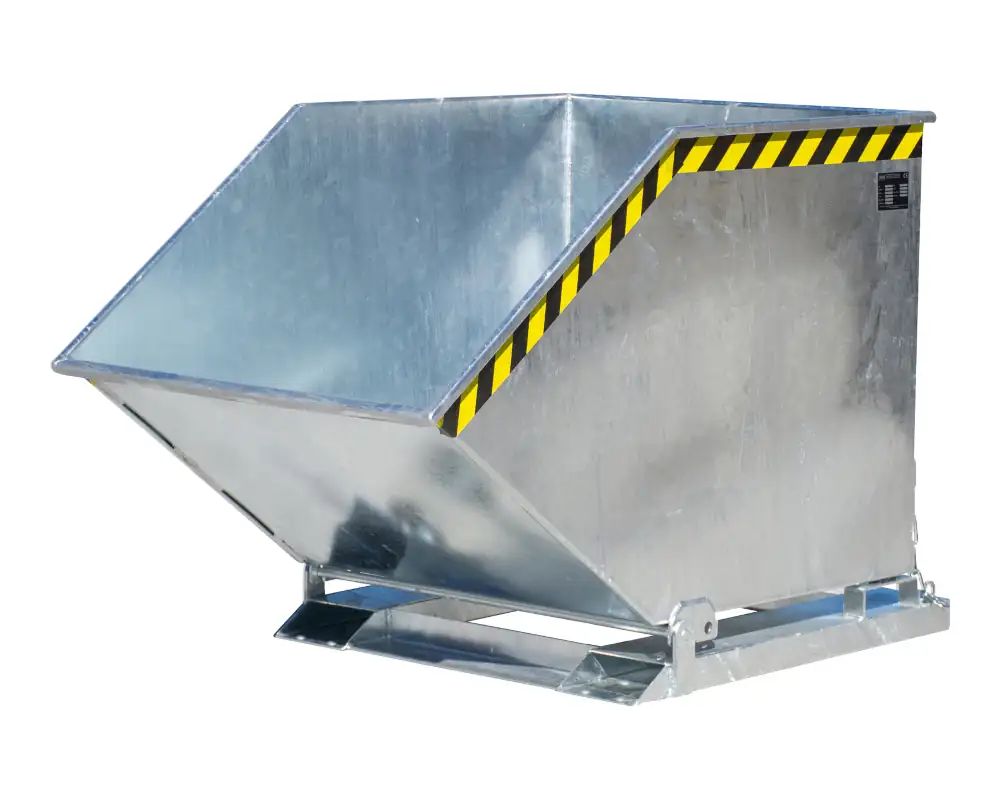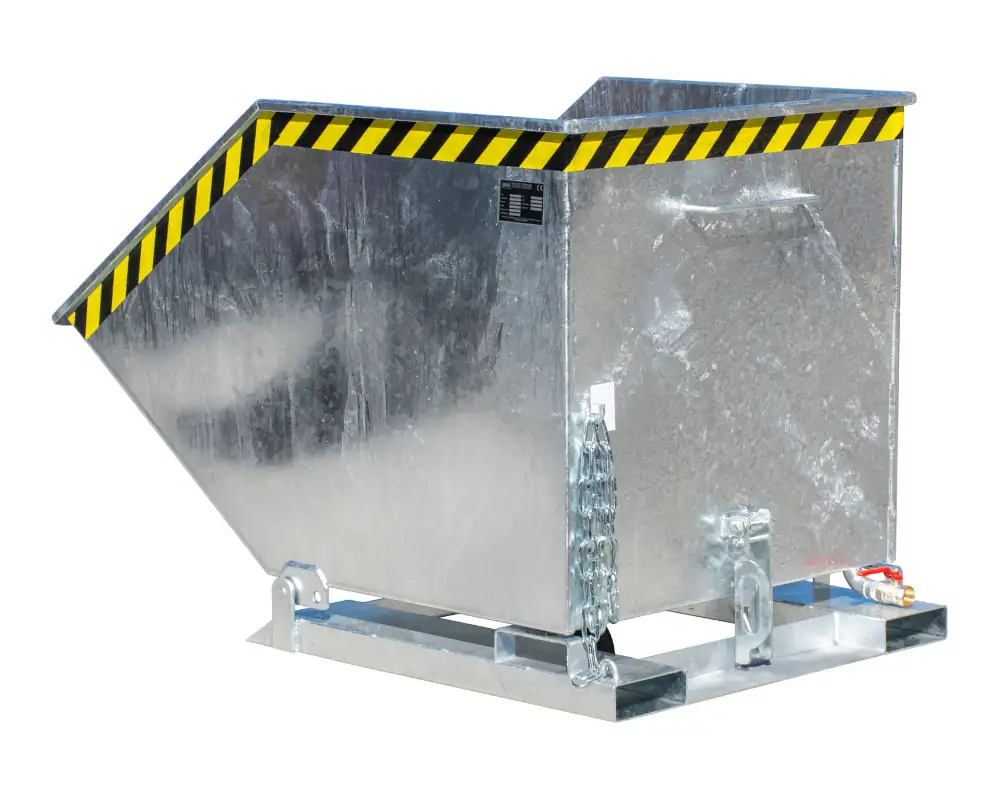 Die Späne-Kippmulde Typ SKK von Bauer eignet sich zum Sammeln, Transportieren und Entsorgen von Späne. Ihre kastenförmige Mulde ist kippbar auf dem stabilen Grundrahmen gelagert. Der Grundrahmen ist mit durchgehend geschlossenen Einfahrtaschen ausgestattet, die der Kippmulde zur Aufnahme mit einem Gabelstapler dienen. Mit dem integrierten Siebeinsatz lassen sich Flüssigkeiten von Feststoffen trennen. Die Flüssigkeit wird in der öl- und wasserdicht verschweißten Mulde aufgefangen und kann über den Ablasshahn abgeführt werden. Für die Entleerung von Hand steht ein Griff am oberen Rand der Mulde zur Verfügung. Beim Transport mit einem Stapler lässt sich der kleine Container mit einer integrierten Kette am Hubmast sichern.