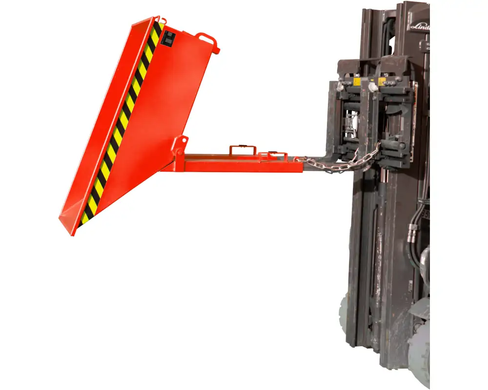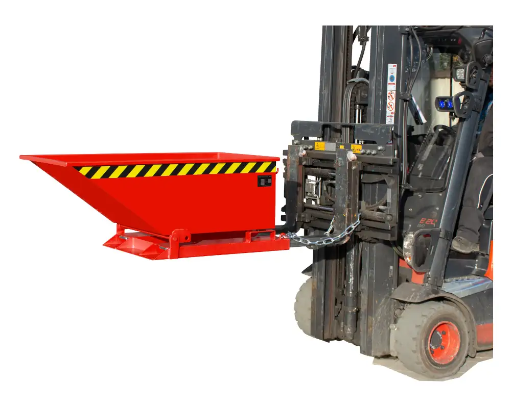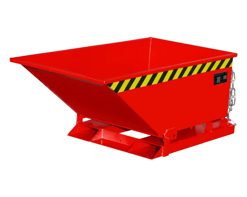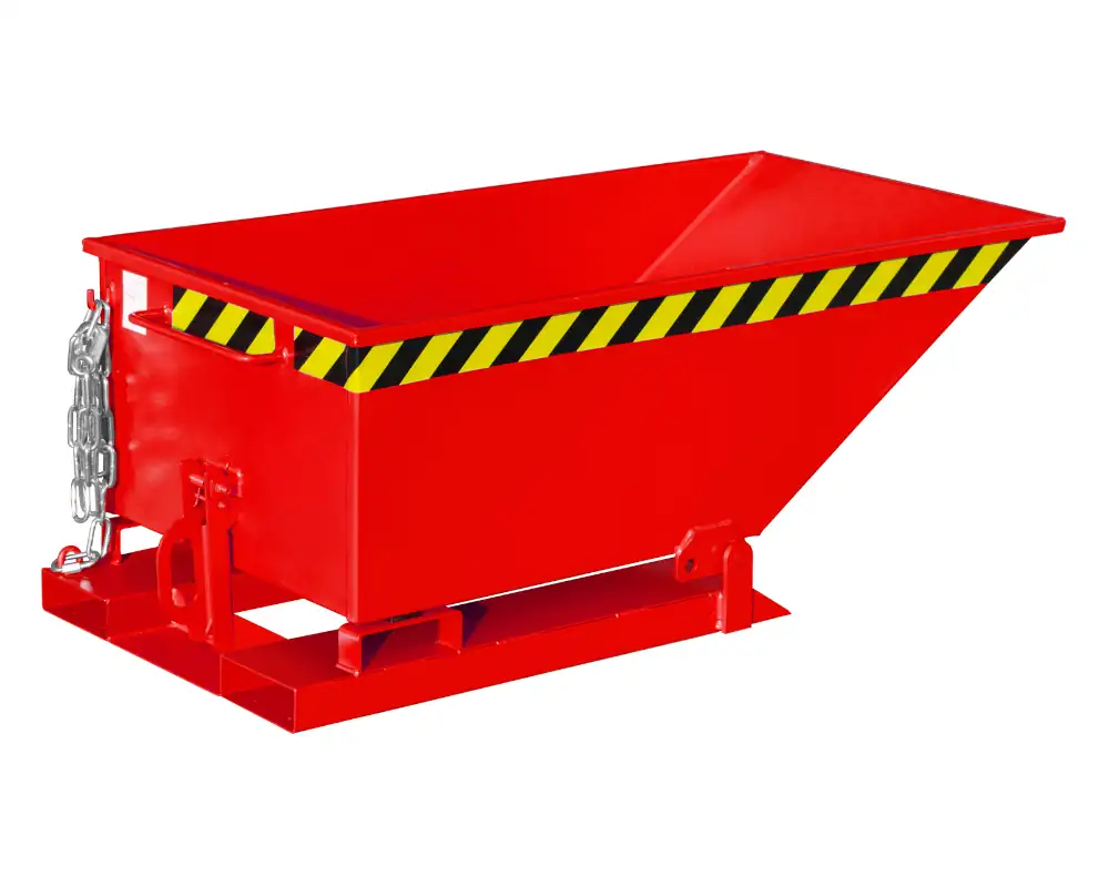Die Kippmulden Typ KN zeichnen sich durch eine besonders niedrige Bauform aus und eigenen sich hervorragend als Beistellbehältnisse. Sie dienen zum Sammeln, Transportieren und Entsorgen von Schüttgütern und Industrieabfällen jeglicher Art. Gegenüber der kastenförmigen Mulde des Typs KK baut die Kippmulde KN äußerst flach. Ihr stabiler Grundrahmen verfügt über durchgehend geschlossene Einfahrtaschen und erleichtert damit die Aufnahme durch Gabelzinken. Ein Fahrwerk bestehend aus Bock- und Lenkrollen lässt sich optional adaptieren. Der Behälter ist damit leicht von Hand zu manövrieren. Das Entleeren erfolgt manuell. Hierzu steht ein Handgriff am oberen Rand des Behälters zur Verfügung. Die Wanne der Kippmulde ist serienmäßig öl- und wasserdicht verschweißt, sodass Flüssigkeiten nicht unkontrolliert entweichen können. Für den Transport mit Gabelstapler sind die Kippmulden mit einer Sicherungskette ausgestattet, die den Behälter gegen Abrutschen sichert.