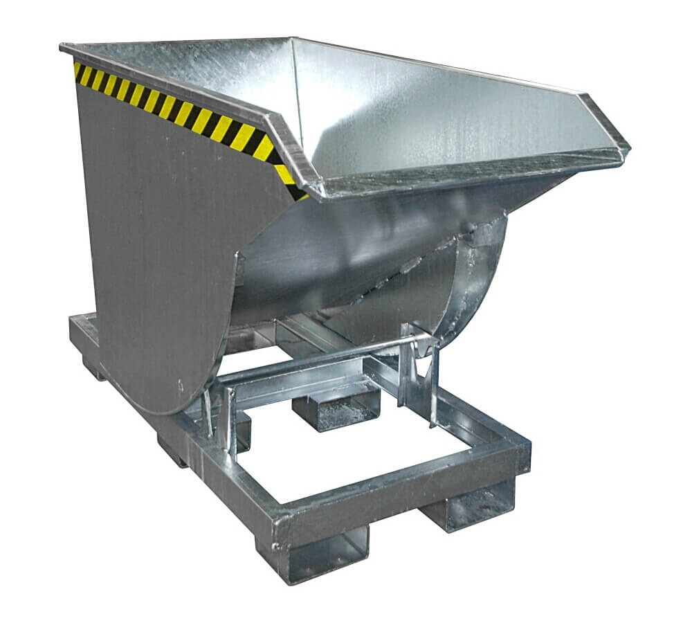 Der Kippbehälter Typ BKM bietet ein großes Fassungsvermögen bei zugleich hoher Tragkraft. Ideal für schwere Schüttgüter oder Industrieabfälle, die gesammelt, transportiert und verladen, umgeschichtet oder entsorgt werden sollen. Seine große Mulde kippt über einen Abrollmechanismus problemlos ab. Der günstige Lastschwerpunkt ermöglicht ein staplerschonendes Entleeren und vereinfacht das Wieder-Aufrichten der Mulde. Ausgelöst wird das Kippen über einen Seilzug bequem vom Fahrersitz aus. Der Kippvorgang kann in jeder Höhe erfolgen und sogar ebenerdig durchgeführt werden.
