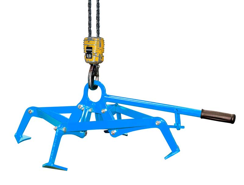 Der Fassgreifer Typ 4P beschleunigt Ihren Fassumschlag und schafft Sicherheit beim Transport. Er eignet sich für Stahl-Spundfässer, Stahl-Deckelfässer, Kunststoff-L-Ringfässer und Kunststoff-Doppel-L-Ringfässer mit einem Inhalt von 200 bis 220 Litern. Zur Aufnahme mit dem Fassgreifer 4P müssen die Fässer aufrecht stehen. Der Greifer wird in den Haken eines Hebezeuges eingehängt und über dem aufzunehmenden Fass abgesenkt. Die Sperrklinke am Führungsrohr wird ausgeklinkt und der Fassgreifer über dem Fass in Position gebracht. Sobald alle Greifarme den Fassrand sicher untergreifen, kann das Fass angehoben werden. Durch den Zug am Laststrang packt der Greifer das Fass umso fester. Beim Abstellen der Last löst sich der Fassgreifer 4P selbsttätig und gibt das Fass wieder frei. Die Greifmethode des Fassgreifers Typ 4P ist für das Fass äußerst schonend, da es an vier Punkten gleichzeitig gegriffen und angehoben wird.