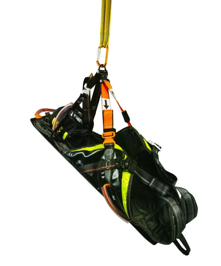 Zudem lassen sich spezielle Aufhängungen an den Trageschlaufen befestigen. Diese können mit einem mobilen Anschlagsystem verbunden werden, mit dem Verletzte beispielsweise aus einem Kanalschacht gerettet werden können. Für ein schnelles Handling sorgt ein klares Farbsystem: alle Anschlagpunkte sind orange gekennzeichnet. CONREST verfügt über eine stabile und massive Gleitplatte, die das sichere Bewegen des Patienten über Kanten oder Hindernisse garantiert. Ein Fußsack, mit dem bei Bedarf auch die Füße fixiert werden können, gehört ebenfalls zur Standardausstattung.