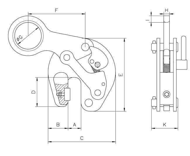 Die Sicherheitsarretierung mit Federspannung hält den Greifer auch ohne Zugbelastung am Transportgut fest. Der Hebel ermöglicht die leichte Handhabung beim Öffnen und Schließen der Greiferbacke und arretiert diese in geöffneter Stellung.