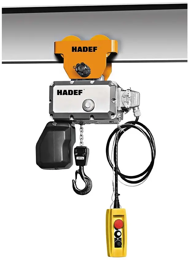 Der Elektrokettenzug 62/05 zeichnet sich durch seine robuste Bauweise und die qualitativ hochwertige Verarbeitung aus. Er wird von Hadef in Düsseldorf hergestellt und ist ein Produkt Made in Germany.