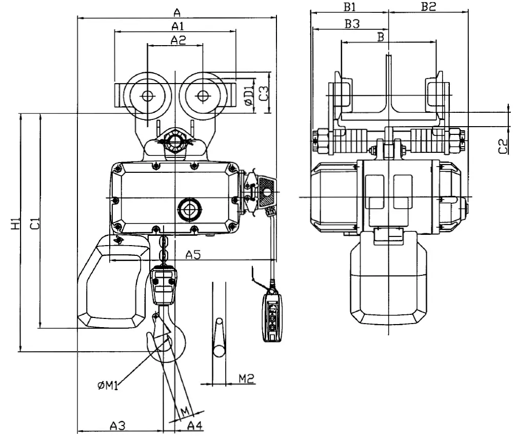 Der Elektrokettenzug in der stationären Variante wird serienmäßig mit einer Ösenaufhängung ausgeliefert. Auf Wunsch ist eine Hakentraverse mit Aufhängehaken wählbar.