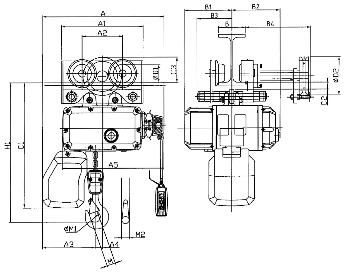 Der Elektrokettenzug in der stationären Variante wird serienmäßig mit einer Ösenaufhängung ausgeliefert. Auf Wunsch ist eine Hakentraverse mit Aufhängehaken wählbar.