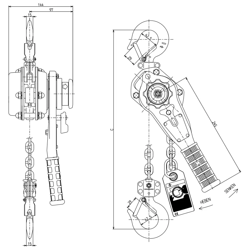 Mit dem Ratschenzug Modell LB werden in der Industrie bevorzugt schwere Zug-, Hebe- und Spannarbeiten durchgeführt. Sein Präzisionsgetriebe mit induktivgehärteten Zahnrädern ist extrem laufruhig, leistungsstabil und langlebig. Auch die tragenden Teile sind gehärtet und verleihen dem Gehäuse eine unvergleichlich große Stabilität.