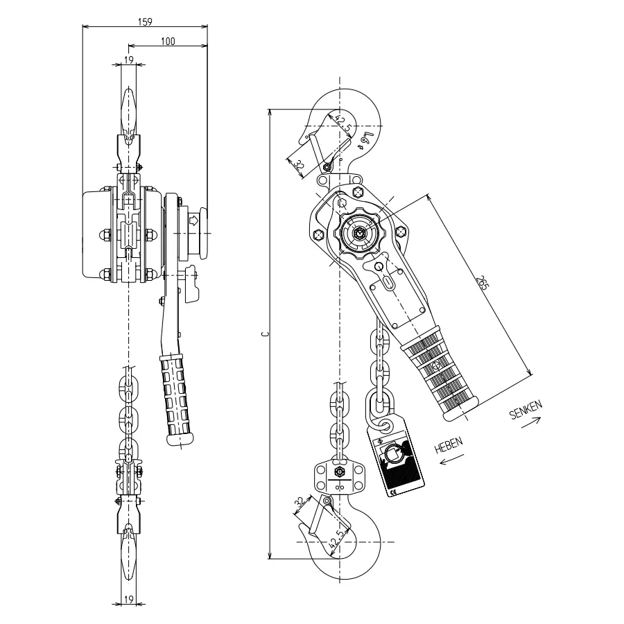 Mit dem Ratschenzug Modell LB werden in der Industrie bevorzugt schwere Zug-, Hebe- und Spannarbeiten durchgeführt. Sein Präzisionsgetriebe mit induktivgehärteten Zahnrädern ist extrem laufruhig, leistungsstabil und langlebig. Auch die tragenden Teile sind gehärtet und verleihen dem Gehäuse eine unvergleichlich große Stabilität.