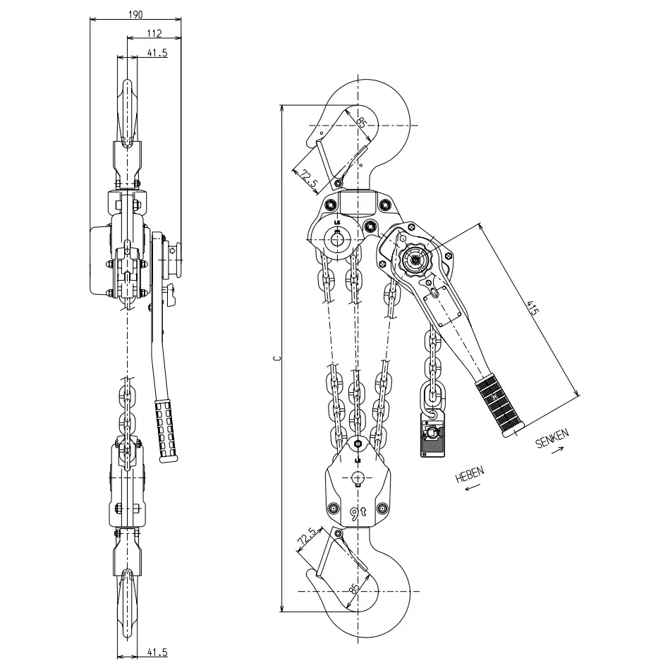 Mit dem Ratschenzug Modell LB werden in der Industrie bevorzugt schwere Zug-, Hebe- und Spannarbeiten durchgeführt. Sein Präzisionsgetriebe mit induktivgehärteten Zahnrädern ist extrem laufruhig, leistungsstabil und langlebig. Auch die tragenden Teile sind gehärtet und verleihen dem Gehäuse eine unvergleichlich große Stabilität.