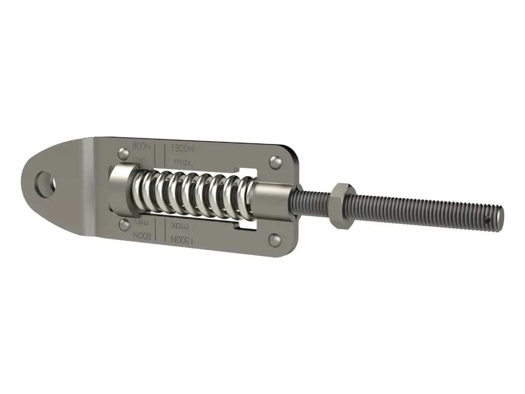 Vorspannelement für die korrekte und ausreichende Vorspannung des Seilsystems, inkl. Kraftbegrenzer. Das Vorspannelement ist einstellbar auf eine Seilspannung von 800 bis 1.300 N, der Kraftbegrenzer minimiert die Kräfte auf unter 6 kN.