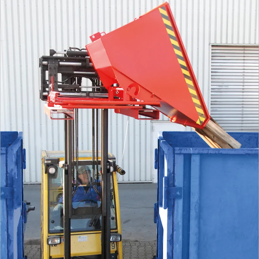 Der Typ 3S ist ein Anbaugerät am Flurförderzeug: Vor dem Einsatz sind Tragfähigkeit von Stapler und Behälter, Lastschwerpunkt sowie die ordnungsgemäße Befestigung zu prüfen. Organisatorisch sind ein freigehaltener Gefahrenbereich beim Kippen, eine angepasste Fahrweise und regelmäßige Sichtprüfungen (Seilzug, Rahmen, Schweißnähte, Einfahrtaschen, Sicherung) entscheidend. Als praxisrelevanter Bezug gilt in Deutschland häufig die DGUV Vorschrift 68 (Flurförderzeuge), insbesondere die Anforderungen für Flurförderzeuge mit Anbaugeräten.