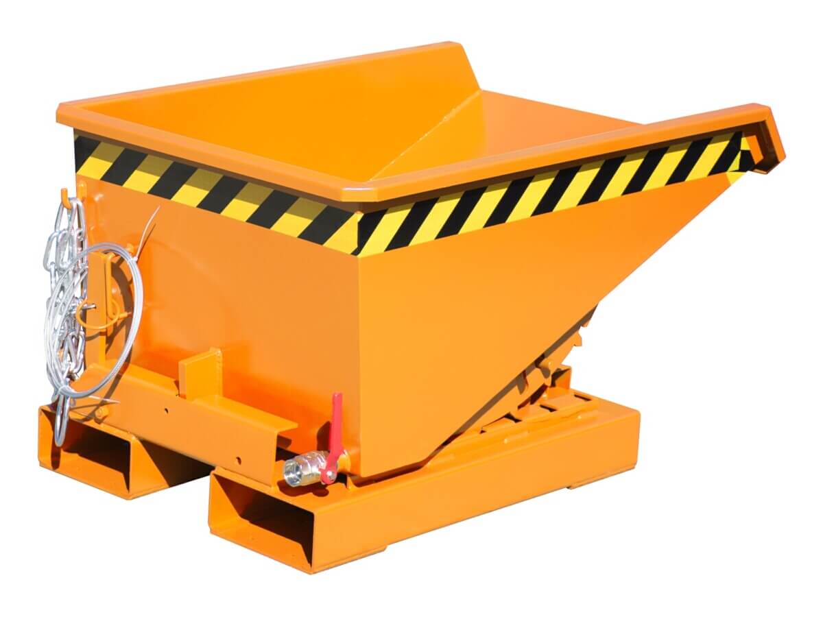 Die robuste Konstruktion aus stabiler Grundplatte mit durchgehend geschlossenen Einfahrtaschen und dickwandiger Mulde mit umlaufendem Randprofil ist für raue Industrieumgebungen ausgelegt. Der Kippmechanismus kann bequem über den Fahrersitz des Staplers per Seilzug ausgelöst werden. Die Mulde rollt über die seitlichen Schienen ab und entleert das Gut staplerschonend. Hierbei sichert eine Kette den Spänebehälter vor dem ungewollten Abrutschen von den Zinken. Der Lastschwerpunkt ist so gewählt, dass größere Stöße beim Kippvorgang weitestgehend vermieden werden und dennoch eine vollständige Entleerung gewährleistet wird.