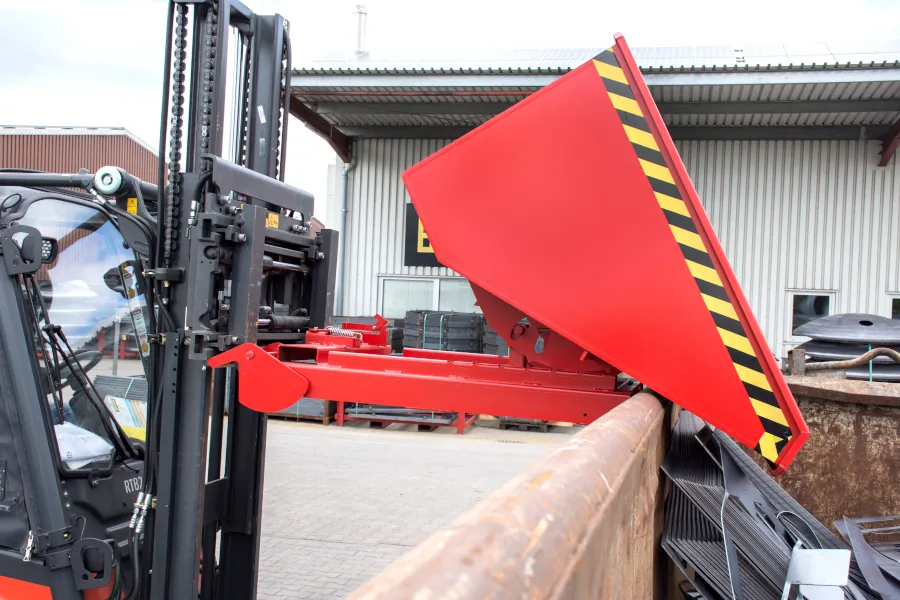 Der Kippbehälter Typ 4A ist ein automatischer Kippbehälter mit Abrollsystem als Stapler-Anbaugerät, der die Aufnahme und das Entleeren deutlich vereinfacht. Eine automatische Sicherung gegen unbeabsichtigtes Abrutschen macht das manuelle Umlegen einer Sicherungskette überflüssig: Es genügt ein leichtes Anheben bei komplett eingefahrenen Gabelzinken, damit die Sicherung einrastet. Zusätzlich sorgen 3 automatische Entriegelungspunkte für ein versetztes Abkippen über dem Container, wodurch sich weiter „in den Container hinein“ entleeren lässt.