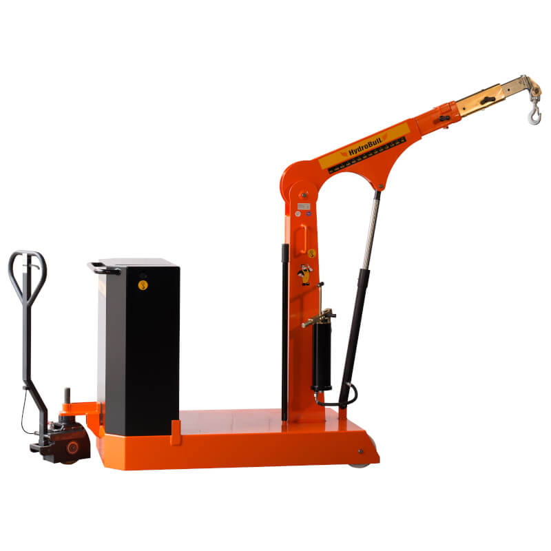 Diese original Hydrobull-Krane mit Gegengewicht haben ein nach hinten verlagertes Fahrgestell und einen Gegengewichtskasten. Durch das Gegengewicht können sie direkt an Lasten und Maschinen anfahren. Die Maschinen können auf durchgängigen Sockeln stehen oder auch sehr breit sein. Die gesamten 13 Positionen befinden sich VOR den Rädern, so dass der Kran über extreme freie Ausladung verfügt. Die freie Ausladung und die große Hubhöhe lässt die Krane häufig im Werkzeugwechsel und bei Wartungsarbeiten (auch oberhalb von Maschinenanlagen oder unter der Decke) tätig sein. Dabei wurde der Gegengewichtskran auf extrem lange Lebensdauer auch unter häufigerem Einsatz ausgelegt.
