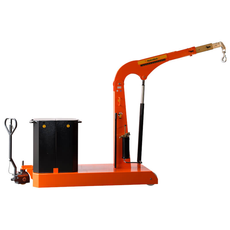 Diese original Hydrobull-Krane mit Gegengewicht haben ein nach hinten verlagertes Fahrgestell und einen Gegengewichtskasten. Durch das Gegengewicht können sie direkt an Lasten und Maschinen anfahren. Die Maschinen können auf durchgängigen Sockeln stehen oder auch sehr breit sein. Die gesamten 13 Positionen befinden sich VOR den Rädern, so dass der Kran über extreme freie Ausladung verfügt. Die freie Ausladung und die große Hubhöhe lässt die Krane häufig im Werkzeugwechsel und bei Wartungsarbeiten (auch oberhalb von Maschinenanlagen oder unter der Decke) tätig sein. Dabei wurde der Gegengewichtskran auf extrem lange Lebensdauer auch unter häufigerem Einsatz ausgelegt.