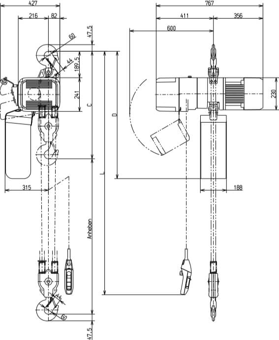 Der Kettenbehälter hängt im Standard D = 920 mm herab. Die Länge des Steuerkabels ist variabel wählbar. Im Standard beträgt der Abstand Steuerschalter Aufhängepunkt L = 2,50 m. Das kleinste Hakenmaß entspricht C = 785 mm.