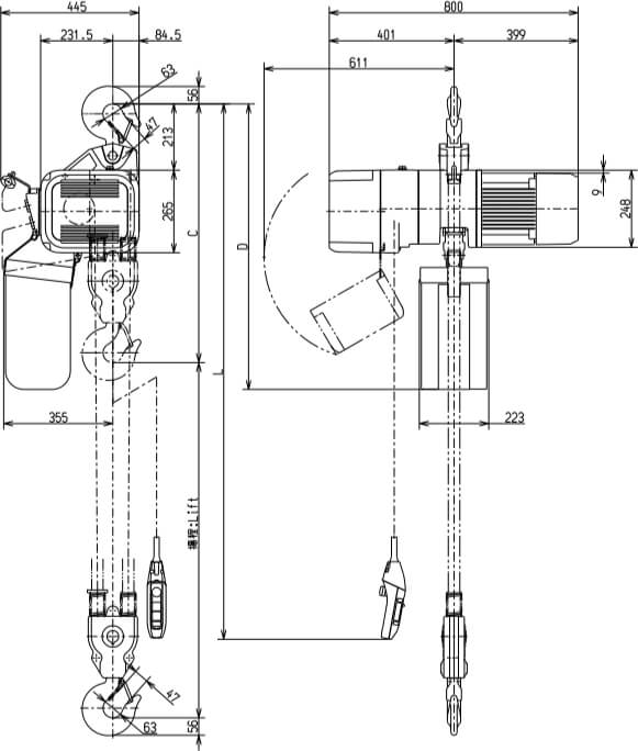 Der Kettenbehälter hängt im Standard D = 920 mm herab. Die Länge des Steuerkabels ist variabel wählbar. Im Standard beträgt der Abstand Steuerschalter Aufhängepunkt L = 2,50 m. Das kleinste Hakenmaß entspricht C = 850 mm.
