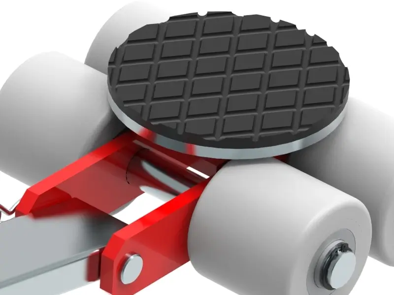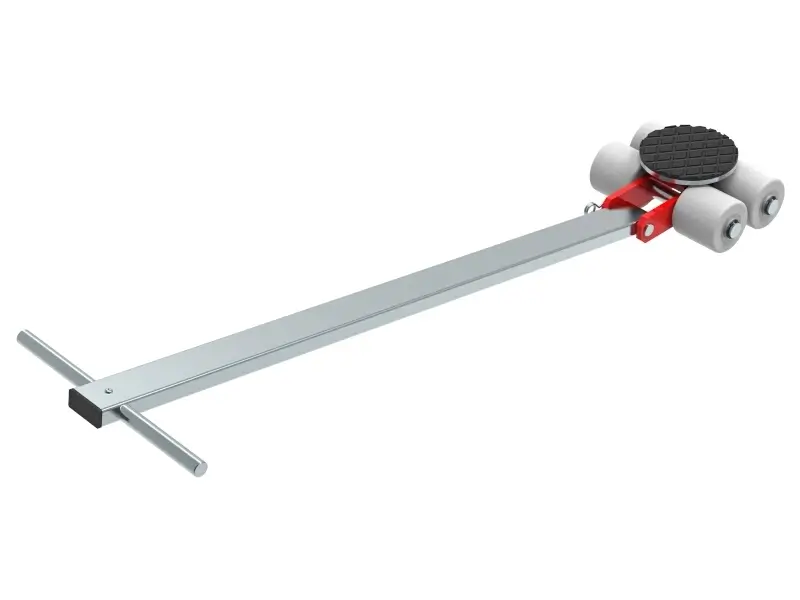 Schwerlasttransportfahrwerk für den professionellen innerbetrieblichen Schwerguttransport auf sauberen und ebenen Böden. Ausführung inkl. Deichsel mit Handgriff oder Anhängeöse, Drehteller mit rutschfestem Waffelgummibelag und hochwertigen HTS Nylonrollen, die abriebfest und nicht markierend sind und für alle glatten Industrieböden geeignet. In Kombination mit einem S-, DUO oder zwei ROTO Fahrwerken mit gleicher Einbauhöhe bilden diese Fahrwerke ein sicheres Gesamtsystem mit 3 Aufnahmepunkten.