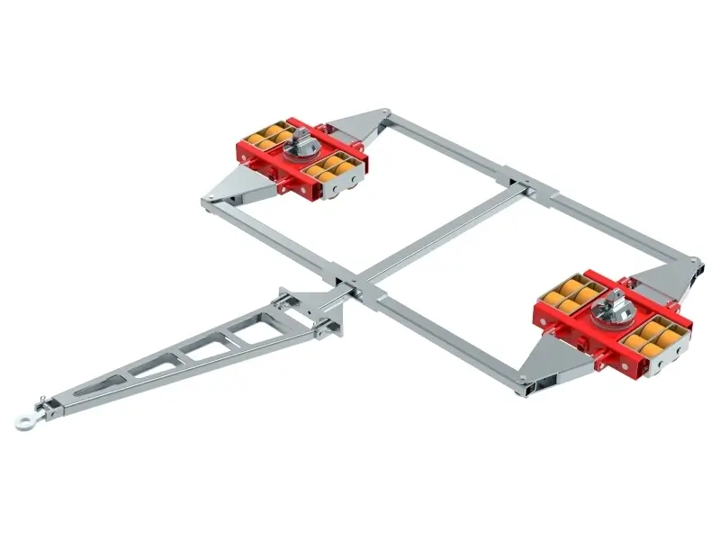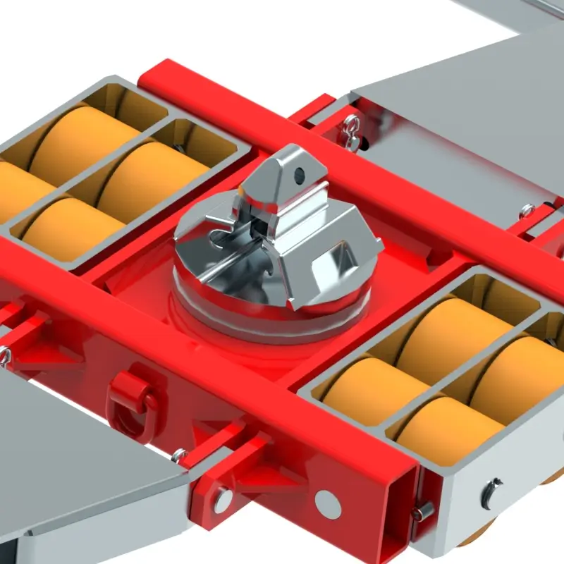 Containertransportfahrwerk für den professionellen innerbetrieblichen Transport von Isocontainern auf sauberen und ebenen Böden. Ausführung inkl. Verbindungsstangen, Deichsel mit Anhängeöse, Auflagefläche glatt mit ISO Container Kegel bzw. Container Sicherung mit Twist Lock (TLS) und hochwertigen HTS 3-Komponenten Polyurethanrollen, die abriebfest, schnitthemmend und nicht markierend sind sowie für alle Böden mit leichten Unebenheiten geeignet. In Kombination mit einem ISOCON Fahrwerk (DUO, S, ROTO) mit gleicher Einbauhöhe, bilden diese Fahrwerke ein sicheres Gesamtsystem mit 4 Aufnahmepunkten für ISO Container. Bitte beachten Sie den Einschlagwinkel von max. 45°. Bei voll ausgenutztem Einschlagwinkel des Fahrwerkes, darf kein zusätzlicher Lenkeinschlag des Zuggerätes erfolgen (siehe Bedienanleitung).