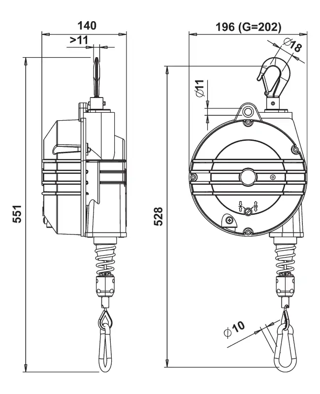 Der Balancer ist ausgestattet mit einer Sicherheitsvorrichtung, die beim Bruch der Trommelfeder eingreift, den Betrieb blockiert und den Fall der angehängten Last verhindert.