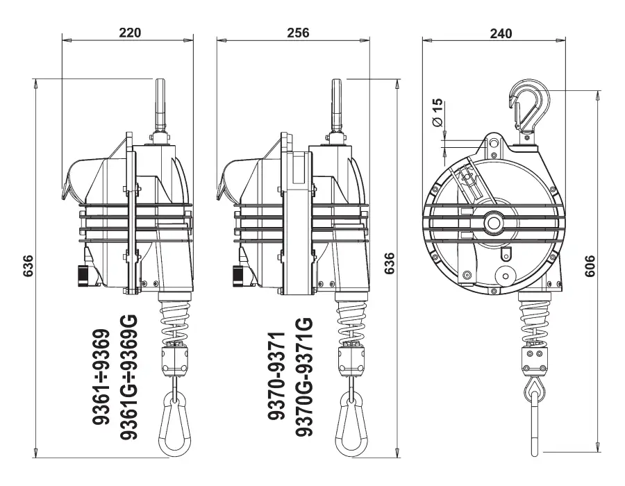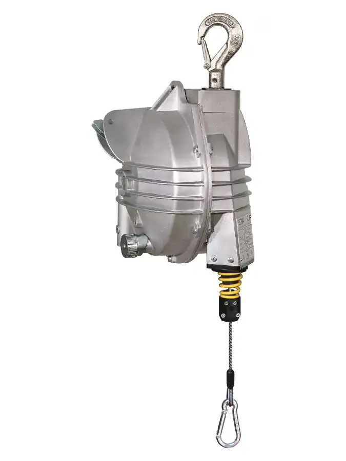 Der Balancer ist ausgestattet mit einer Sicherheitsvorrichtung, die beim Bruch der Trommelfeder eingreift, den Betrieb blockiert und den Fall der angehängten Last verhindert.