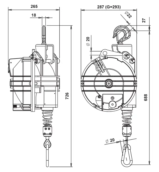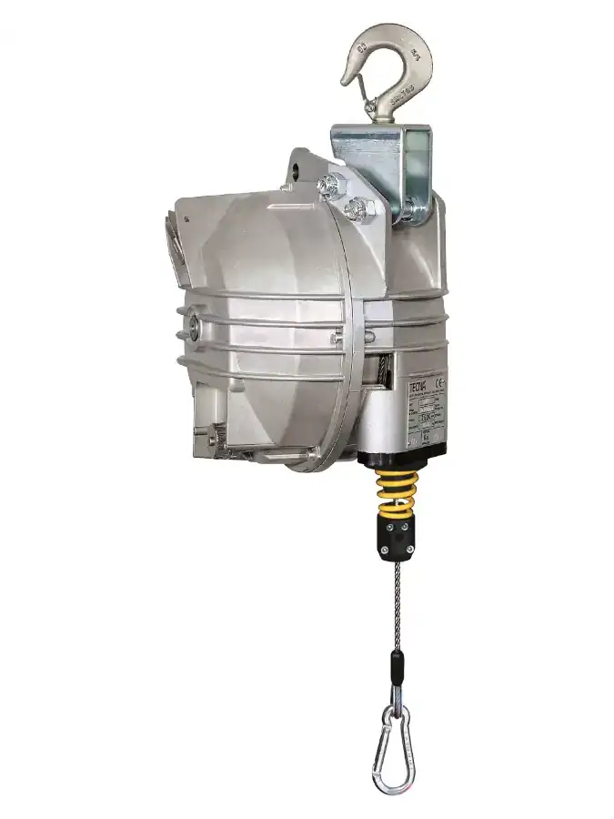 Der Balancer ist ausgestattet mit einer Sicherheitsvorrichtung, die beim Bruch der Trommelfeder eingreift, den Betrieb blockiert und den Fall der angehängten Last verhindert.