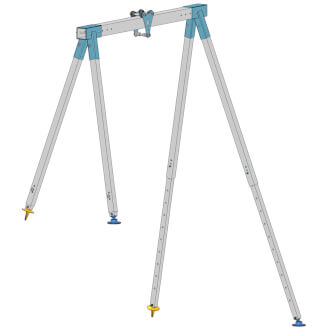 Die Träger und Stützen des Alu-Vierbeins sind aus hochwertigen Aluminium-Profilen gefertigt. Dadurch ist die Konstruktion sehr leicht und lässt sich einfach von einer Person tragen und aufstellen. Die Stützen sind in der Höhe verstellbar. Dies erweist sich besonders beim Einsatz in unebenem Gelände oder beim Abladen von Transportern als vorteilhaft.